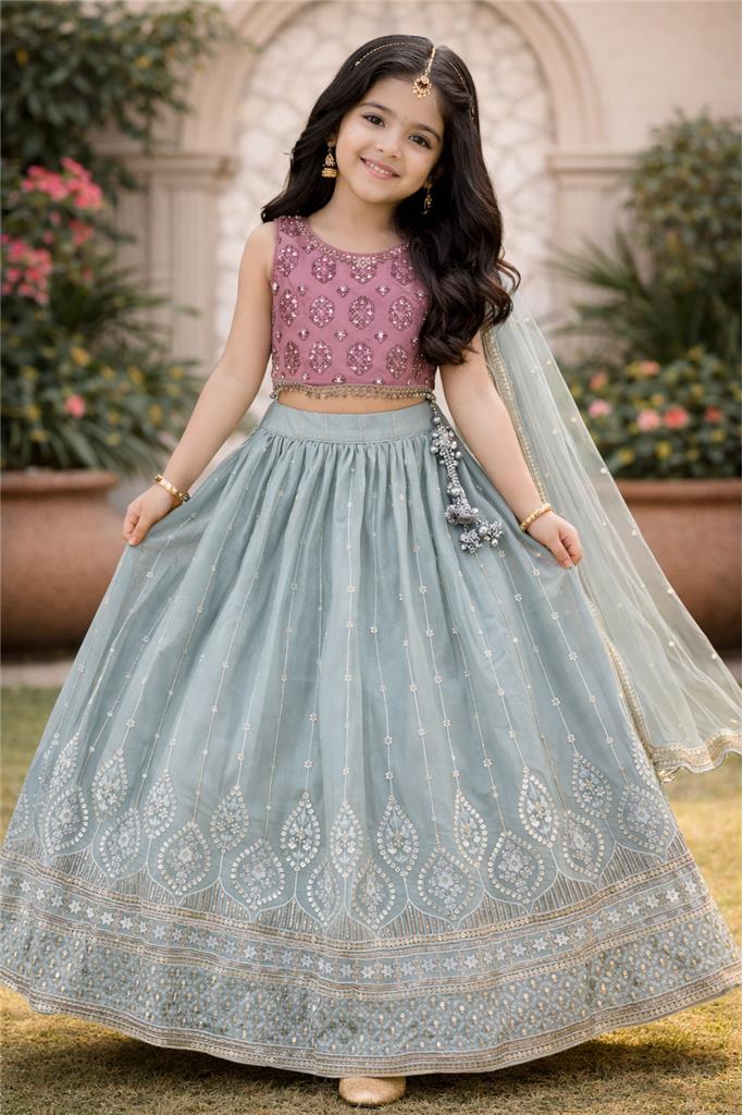 • Stylish Pink & Grey Combination – Beautiful blend of pink and grey enhanced with gold design for a rich and elegant look. • Elegant Gold Embellishment – Detailed gold work adds a luxurious and festive touch. • Stylish Lehenga Design – Flowy and flared silhouette gives a graceful and traditional appearance. • Comfortable & Kid-Friendly Fit – Designed for easy movement and all-day comfort. • Perfect for Special Occasions – Ideal for weddings, festive events, birthdays, and family functions.