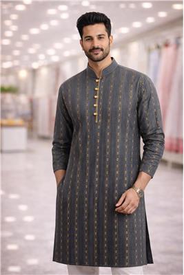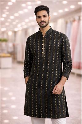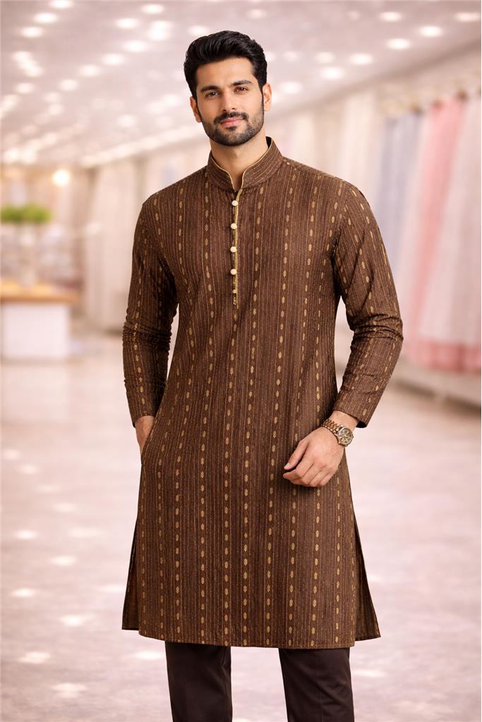 ✨ Refined Tradition, Modern Edge - A rich colour kurta designed to make a bold yet elegant statement. 🟤 Sophisticated Pattern Detailing - Subtle vertical motifs add depth and a premium look. 👔 Tailored for a Sharp Fit - Structured silhouette that enhances your style effortlessly. 🌟 Perfect for Special Occasions - Ideal for weddings, festive wear, and evening gatherings. 💫 Timeless & Versatile - A classic piece that never goes out of style.