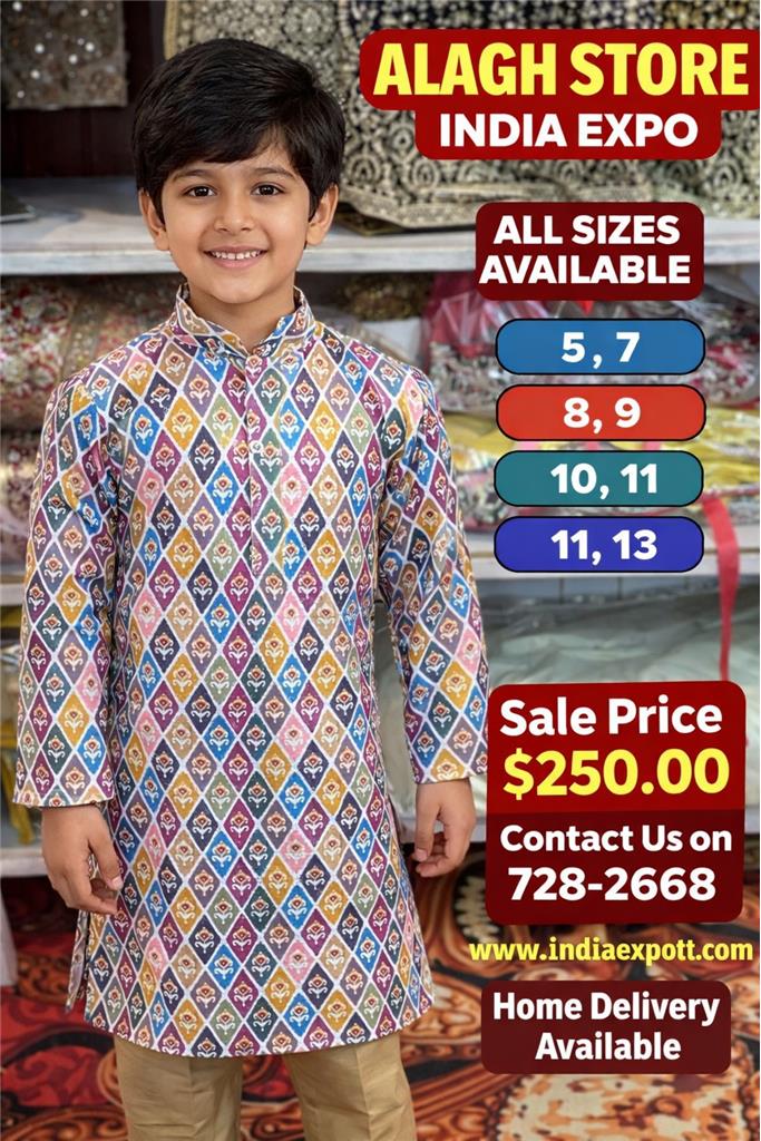 Stylish kids ethnic kurta with vibrant all-over print Eye-catching multicolor geometric motif design Classic mandarin (band) collar for a traditional touch Front button placket for easy wear and neat finish Full-length sleeves with a comfortable, straight fit Made from soft, breathable fabric for all-day comfort Lightweight and skin-friendly — perfect for kids Ideal for festivals, weddings, Eid, family functions, and parties Easy to pair with pajama, churidar, or trousers A perfect blend of traditional charm and modern style
