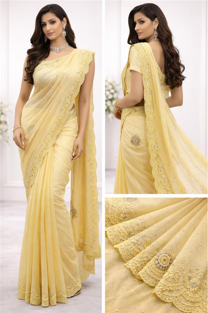 • Bright Yellow Color – Beautiful vibrant yellow shade enhanced with silver gem detailing for a fresh and eye-catching look. • Premium Tissue Silk Fabric – Lightweight fabric with a soft shine that gives a rich and graceful finish. • Silver Gem Work – Subtle yet elegant gem embellishments add a touch of sparkle and sophistication. • Free Size Fit – Designed to comfortably suit a variety of body types. • Lightweight & Comfortable – Perfect for long wear while maintaining a stylish appearance. • Perfect for Occasions – Ideal for festive wear, parties, and special gatherings.