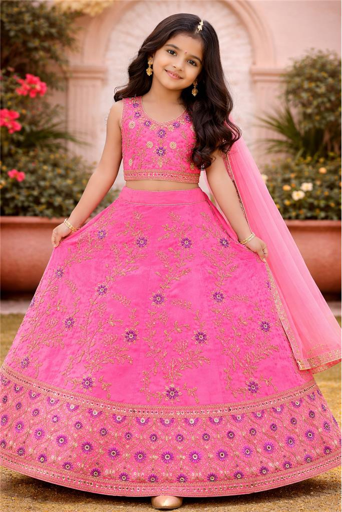 • Beautiful Pink Color – Elegant pink lehenga enhanced with purple & gold design for a vibrant and festive look. • Purple & Gold Embellishment – Stylish color combination adds a rich, eye-catching, and traditional appeal. • Stylish Lehenga Design – Flowy and flared silhouette gives a graceful and charming appearance. • Comfortable & Kid-Friendly Fit – Designed for easy movement and all-day comfort. • Perfect for Special Occasions – Ideal for weddings, festive events, birthdays, and family functions.