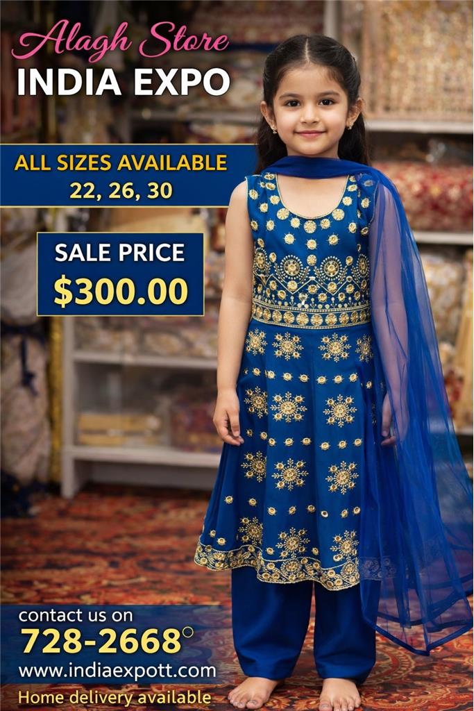 Beautiful girls ethnic suit set with elegant traditional appeal Rich royal blue color enhanced with detailed gold embroidery Sleeveless embroidered kurta/top with intricate floral and geometric motifs Matching salwar/pants for a complete coordinated look Comes with a soft, flowy net/chiffon dupatta for added grace Fine gold threadwork on neckline, bodice, and hemline Crafted from comfortable, skin-friendly fabric suitable for kids Lightweight and easy to wear for long hours Perfect for weddings, Eid, Diwali, parties, and festive occasions A perfect blend of traditional elegance and modern style