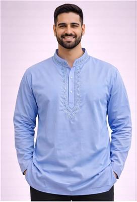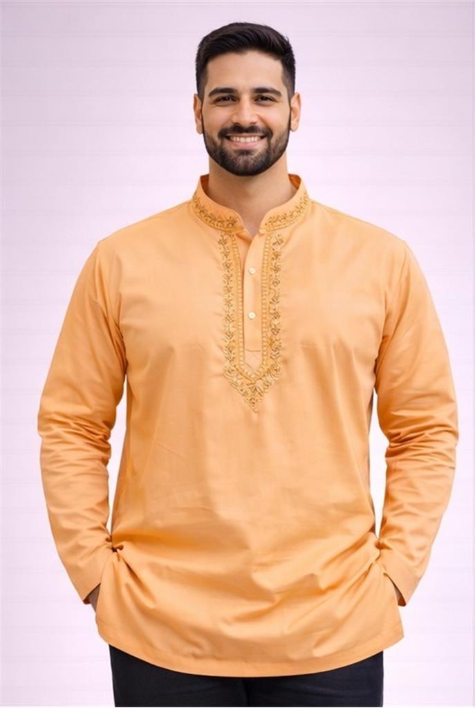 Elegant Peach & Blue Embroidered Cotton Kurta Collection Description: • 🍑 Soft Peach Kurta with elegant gold embroidery • 🔵 Stylish Blue Kurta with silver embroidery design • 🌿 Premium Cotton Fabric – breathable & comfortable • 👕 Long Sleeve Design for a classic traditional look • ✨ Stylish Embroidered Neckline for a premium finish • 📏 Available Sizes: 38–52 • 🎉 Perfect for festivals, weddings & special occasions