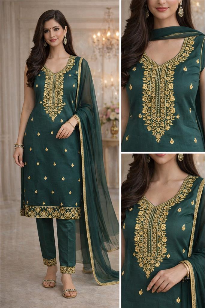 • Elegant Color – Shade enhanced with gold embroidery design for a bold and premium look. • Intricate Gold Embroidery – Detailed craftsmanship adds a luxurious and traditional touch. • Complete 3-Piece Set – Includes kurta, matching pants, and shawl for a perfectly coordinated outfit. • Premium Cotton Fabric – Soft, breathable cotton material ensures comfort for all-day wear. • Comfortable & Stylish Fit – Designed to provide ease of movement while maintaining a neat and elegant silhouette. • Perfect for Occasions – Ideal for casual wear, festive events, and family gatherings.