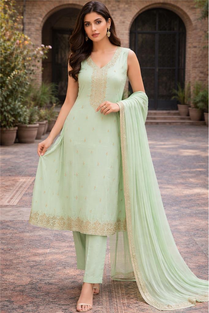 • Elegant Sage Green Color – Soft sage green shade enhanced with gold embroidery design for a refined and graceful look. • Intricate Gold Embroidery – Detailed craftsmanship adds a rich and traditional touch with a subtle shine. • Complete 3-Piece Set – Includes kurta, matching pants, and shawl for a perfectly coordinated outfit. • Premium Cotton Fabric – Soft, breathable cotton material ensures comfort for all-day wear. • Comfortable & Elegant Fit – Designed to provide ease of movement while maintaining a neat and stylish silhouette. • Perfect for Occasions – Ideal for festive wear, family gatherings, and special events.