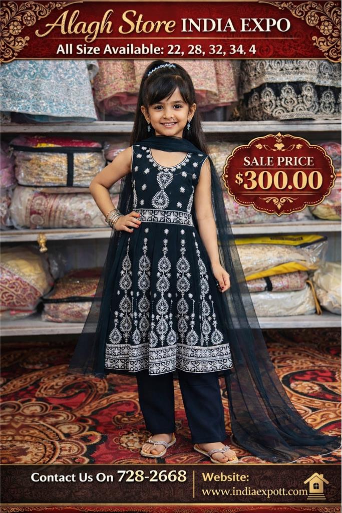 ✨ Girls Elegant Blue Embroidered Suit Set ✨ Premium quality fabric for a soft and comfortable feel Beautiful white embroidery with intricate traditional motifs Sleeveless kurta with a stylish round neckline Comes with matching straight-fit pants for a complete look Lightweight sheer dupatta adds graceful charm Breathable & skin-friendly material, perfect for kids Elegant black color for a classy ethnic appearance Comfortable fit allowing easy movement Ideal for festivals, weddings, parties & special occasions Easy to maintain and durable for regular use
