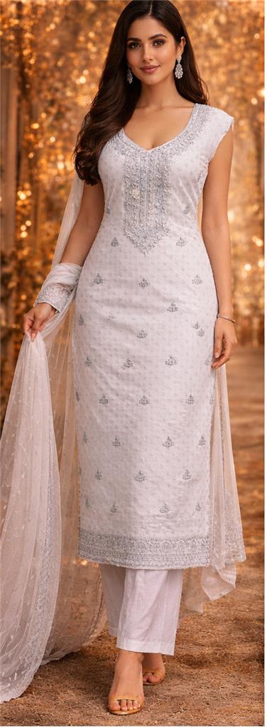 • Elegant White Color – Classic white shade enhanced with silver working for a graceful and premium look. • Intricate Silver Embroidery – Beautiful detailed silver embroidery on the front and borders adds a sophisticated and festive touch. • Complete 3-Piece Set – Includes kurta, matching pants, and dupatta for a fully coordinated outfit. • Premium Cotton Fabric – Made from cotton, ensuring a soft, breathable, and comfortable feel. • Stylish & Comfortable Fit – Designed to provide ease of movement while maintaining an elegant silhouette. • Perfect for Occasions – Ideal for festive wear, parties, family gatherings, and special events.