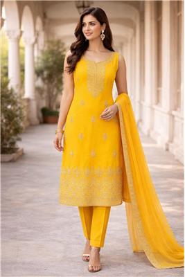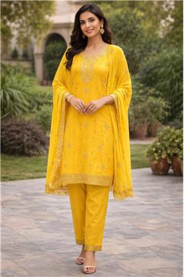 • Elegant Colors – Beautiful shade enhanced with gold embroidery design for a rich and luxurious look. • Intricate Gold Embroidery – Detailed craftsmanship adds a premium, traditional touch with a subtle shine. • Complete 3-Piece Set – Includes kurta, matching pants, and shawl for a fully coordinated outfit. • Flowy Chiffon Fabric – Lightweight chiffon material gives a soft, airy feel with a graceful drape. • Comfortable & Stylish Fit – Designed to provide ease of movement while maintaining a refined silhouette. • Perfect for Occasions – Ideal for festive wear, parties, and special gatherings.