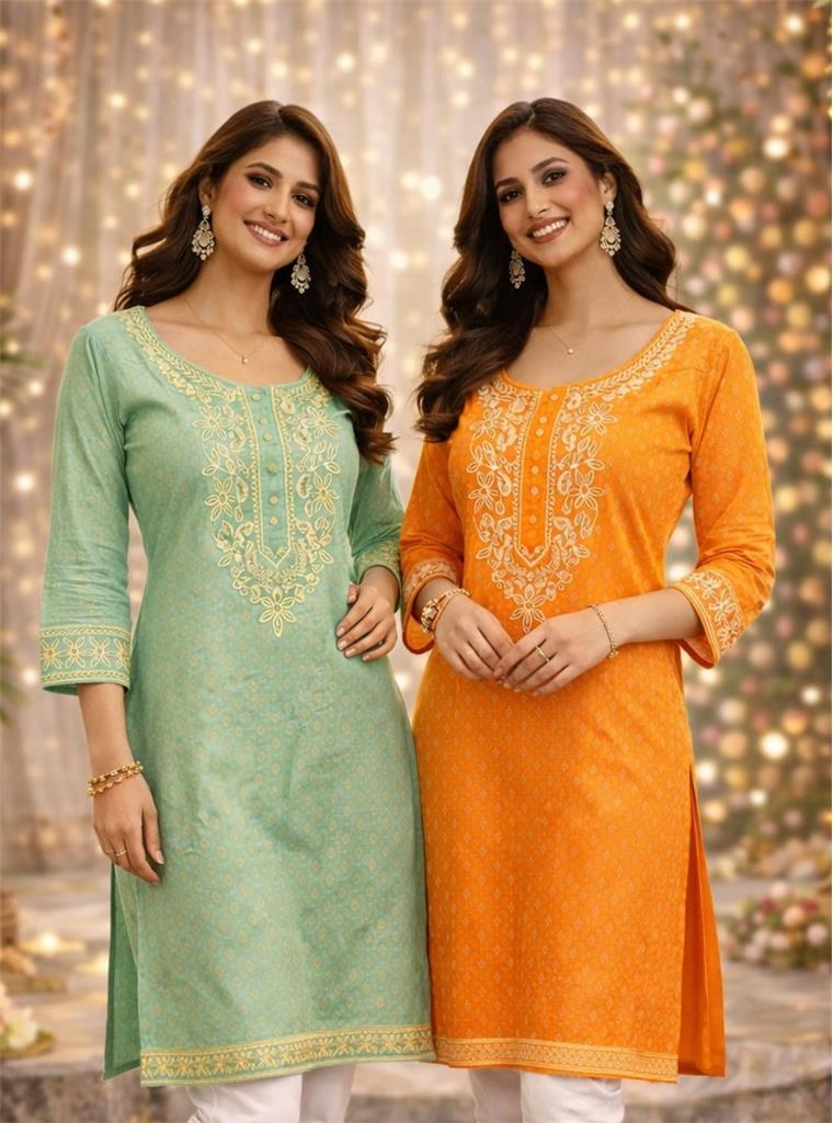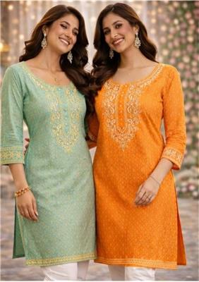 Fresh Elegance Cotton Kurti Top Collection Description Made from soft, breathable cotton material for everyday comfort Features delicate gold & cream embroidery design for a refined, elegant look Available in 2 vibrant colors: Mint Green & Orange Stylish kurta-style tops with a flattering and comfortable fit Perfect for casual wear, festive occasions & daytime outings Lightweight fabric ensures all-day comfort and ease Sizes available: 38 – 52 Additional Details: Available in Penal & Endeavour Home delivery available Free delivery on orders above $500