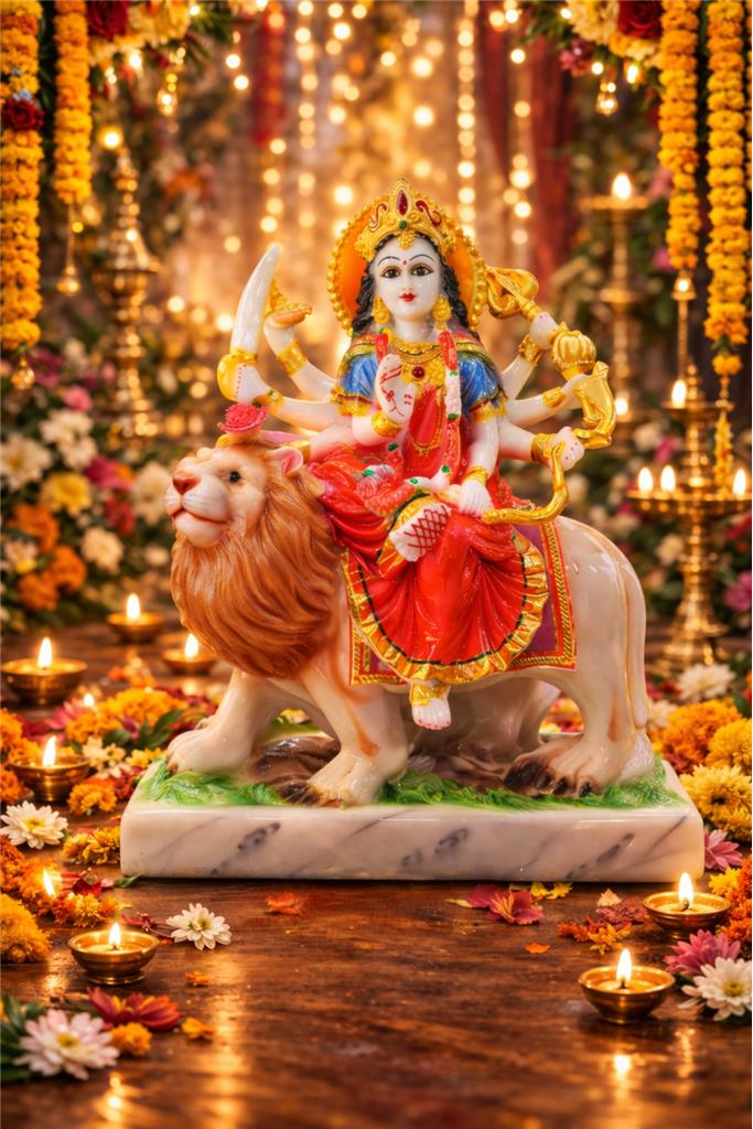 • Divine Maa Durga Idol – Beautifully crafted murti of Maa Durga seated on a tiger, symbolizing power, protection, and positivity. • Premium Marble Dust Material – Made from high-quality marble dust for a solid, durable, and premium finish. • Vibrant Hand-Painted Design – Rich colors with intricate detailing enhance the spiritual and decorative appeal. • Perfect for Home & Mandir – Ideal for home temples, पूजा spaces, or as a sacred decorative piece. • Auspicious & Spiritual Presence – Brings blessings, strength, and positive energy into your home. • Perfect for Gifting – Ideal for religious occasions, housewarming, festivals, and special celebrations.