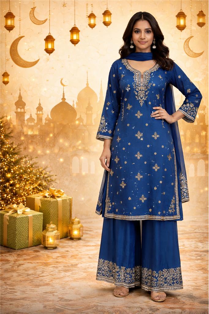 ✨ Graceful Eid Special Palazzo Suit Set in a rich royal blue shade ✨ Beautiful gold embroidery spread across kurta, sleeves, hem & palazzo ✨ Delicate traditional motifs add a classy, festive charm ✨ Stylish palazzo-style pants for comfort and effortless elegance ✨ Straight-cut kurta with finely embroidered neckline ✨ Comes with a matching dupatta to complete the ethnic look ✨ Comfortable, flowy design ideal for long festive wear ✨ Perfect for Eid celebrations, weddings, festive events & gatherings ✨ Size Available: 44 ✨ Premium finish blending traditional elegance with modern style