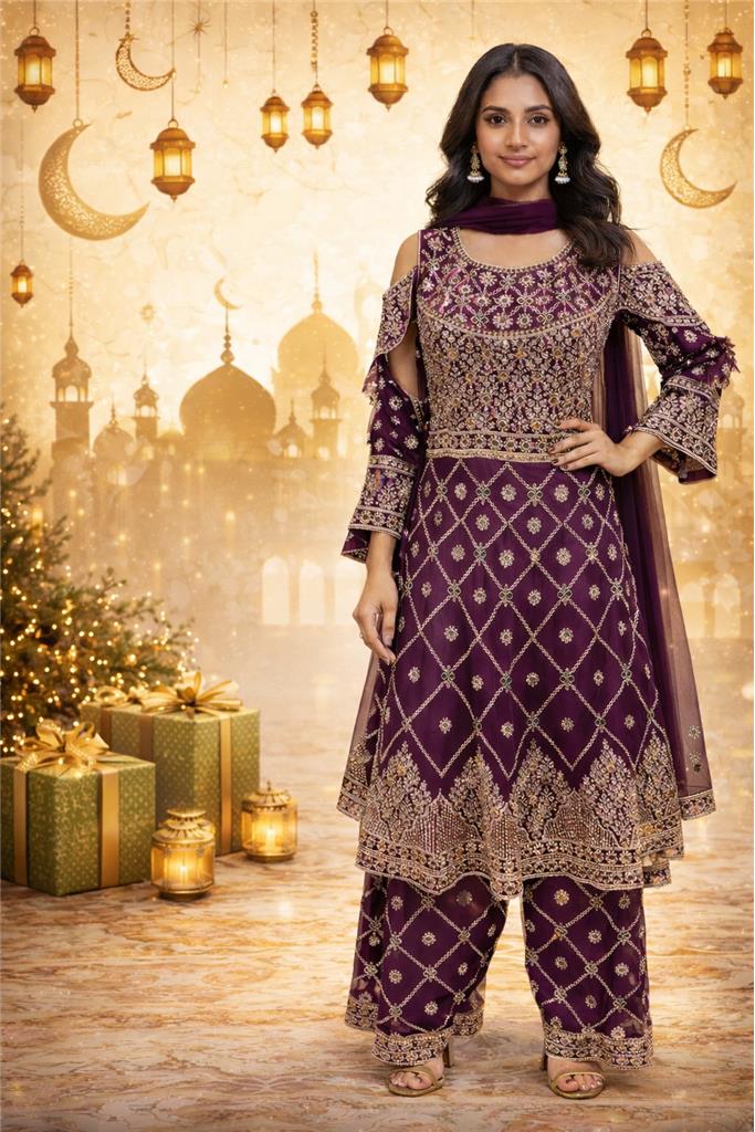 ✨ Elegant Embroidered Palazzo Suit Set ✨ Beautiful deep purple suit set featuring rich all-over embroidery for a luxurious festive look Intricate golden threadwork on the neckline, bodice, sleeves, and hem adds royal elegance Stylish cold-shoulder sleeve design gives a modern touch to traditional wear Comfortable palazzo-style pants with matching embroidery for a graceful, flowy silhouette Premium fabric that feels soft on the skin and drapes beautifully Perfectly coordinated dupatta enhances the overall ethnic appeal Designed to flatter the figure while ensuring all-day comfort Ideal for Eid, weddings, festive celebrations, poojas, and special occasions Easy to style with traditional jewelry, heels, or juttis for a complete look Available size: 42