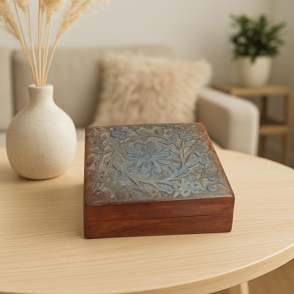 ✨ A timeless keepsake, this jewelry box is crafted with care and tradition – perfect for adding elegance to your space while safeguarding your treasures. ✅ Material – Made from durable teakwood ✅ Craftsmanship – Hand-carved with floral patterns, showcasing intricate artistry ✅ Origin & Style – Inspired by Indian craftsmanship, particularly from Kashmir ✅ Purpose – Ideal for storing jewelry, keepsakes, trinkets, or even spices ✅ Compact Size – Length: 0.8 ft | Height: 0.3 ft – Perfect for bedside, vanity, or shelf display ✅ Vintage Appeal – Adds a touch of tradition & elegance to modern or classic interiors 💎 A beautiful blend of functionality and artistry – both a utility box and a decorative piece.