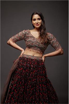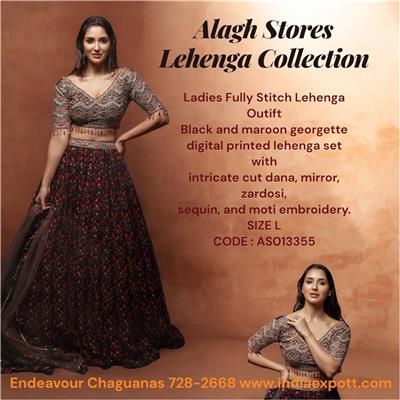 ✨ Fully stitched ladies lehenga outfit for a perfect ready-to-wear fit ✨ Elegant black and maroon georgette fabric with rich digital prints ✨ Detailed cut dana, mirror, zardosi, sequin, and moti embroidery for a luxurious look ✨ Lightweight yet flowy fabric for graceful movement and comfort ✨ Beautiful color combination ideal for weddings, parties, and festive occasions ✨ Size: Large – designed for a flattering and comfortable fit ✨ 2-piece set, perfect for effortless styling and elegance