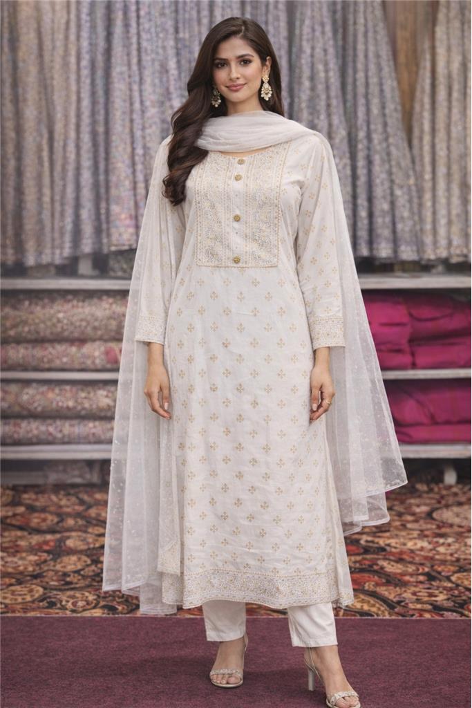 🔹Elegant ivory/white kurta set featuring delicate all-over woven motifs. 🔹Kurta designed with a straight silhouette for a graceful and flattering fit. 🔹Intricate embroidery on the yoke and hem adds a touch of sophistication. 🔹Button-down detail on the front enhances the classic ethnic appeal. 🔹Paired with matching straight pants for a complete, coordinated look. 🔹Comes with a lightweight sheer dupatta that adds softness and flow. 🔹Full sleeves with subtle embroidered cuffs for an elegant finish. 🔹Crafted from breathable, comfortable fabric, ideal for extended wear. 🔹Perfect for festive occasions, weddings, celebrations, or formal gatherings. 🔹Can be styled with statement earrings and heels for a polished ethnic look.