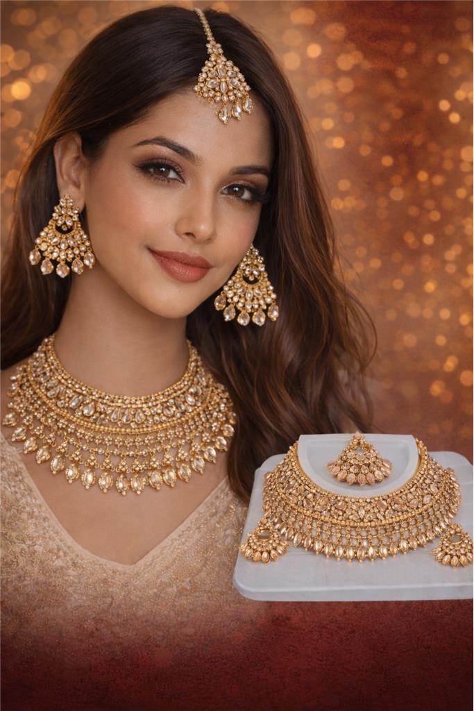 Exquisite traditional gold-toned bridal jewelry set with intricate craftsmanship Features a statement choker-style necklace with layered detailing and delicate drop motifs Paired with matching heavy jhumka-style earrings for a regal, coordinated look Comes with a beautifully designed maang tikka that completes the bridal ensemble Inspired by classic Indian heritage designs with a luxurious, royal finish Rich polish and fine detailing enhance shine and visual depth Ideal for weddings, receptions, engagements, and festive occasions Complements lehengas, sarees, and anarkalis effortlessly Lightweight yet grand—designed for comfort during long wear Perfect choice for brides seeking an elegant, timeless traditional look