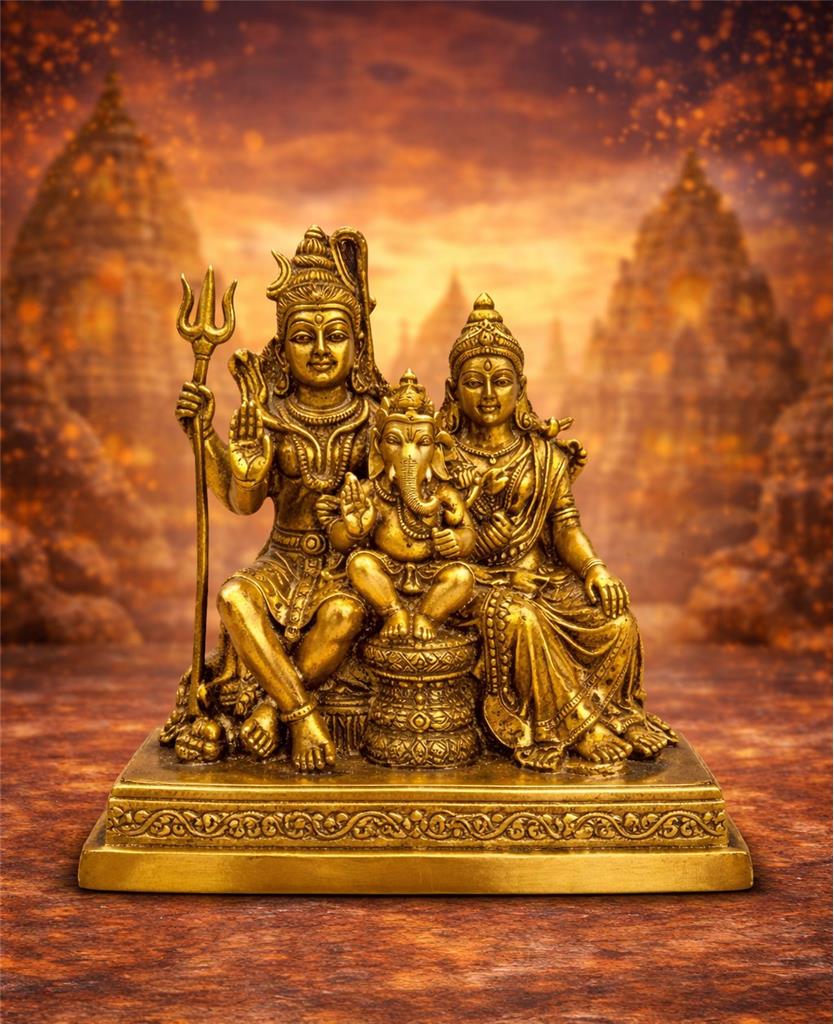 Brass Shiva Parivar Murti – 5 Inch Bring divine blessings and spiritual harmony into your space with this beautifully crafted Shiva Parivar Murti, made from high-quality brass. This sacred idol features Lord Shiva, Goddess Parvati, Lord Ganesha, symbolizing family unity, prosperity, protection, and spiritual strength. The antique brass finish, intricate detailing, and balanced design make this murti a perfect choice for home mandir, office altar, temple worship, and auspicious gifting. Despite its compact 5-inch size, the murti reflects grandeur, devotion, and timeless craftsmanship. ✨ Product Highlights: Material: Premium Brass Size: 5 Inch Detailed carving with antique golden finish Strong, durable & long-lasting Ideal for daily pooja & festive worship 🪔 Spiritual Significance: Worshipping the Shiva Parivar is believed to remove negativity, strengthen family bonds, attract peace and prosperity, and bring divine protection. It is especially auspicious for Shivratri, Diwali, Griha Pravesh, weddings, and spiritual occasions. 🎁 Perfect For: Home décor • Office décor • Temple use • Housewarming gifts • Religious gifting