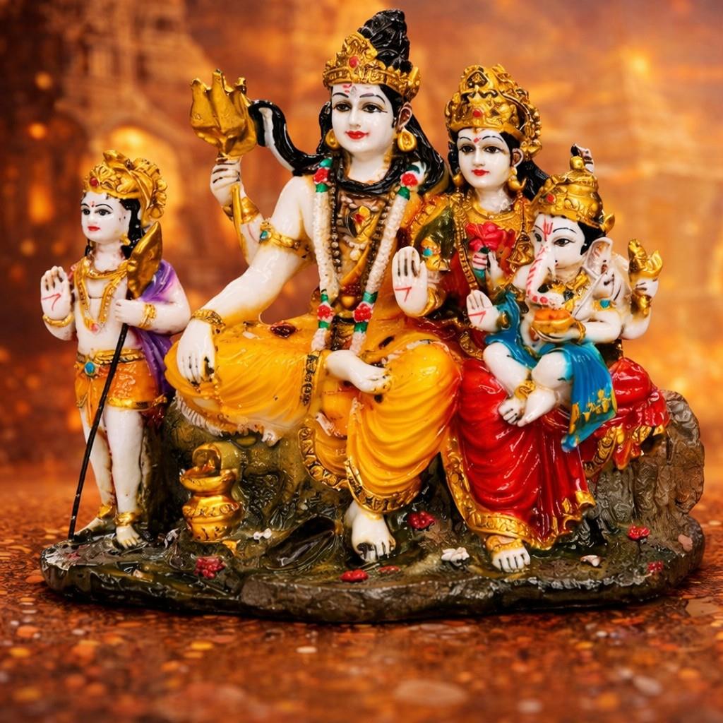 This beautiful Shiva Family Murti, crafted from fine marble dust, radiates harmony, divinity, and the sacred balance of cosmic energy. Depicting Lord Shiva, Goddess Parvati, Lord Ganesha & Kartikeya, this idol embodies the unity of divine power, protection, and prosperity within the sacred household. Lord Shiva, the eternal yogi, represents consciousness and strength. Goddess Parvati, the nurturing mother, reflects love, devotion, and Shakti—the energy that sustains creation. Lord Ganesha, their beloved son, is the remover of obstacles and bestower of wisdom and success. Lord Kartikeya isis worshipped to overcome obstacles, gain spiritual strength, destroy evil influences (like Tarakasura), and for protection, discipline, and knowledge. Together, they symbolize the completeness of family life, where spiritual strength, compassion, and prosperity flow as one. Placing this murti in your home or temple invokes blessings of peace, unity, protection, and abundance. It serves as a reminder that true divinity is experienced not only in meditation and worship but also in the sacred bonds of family and togetherness.
