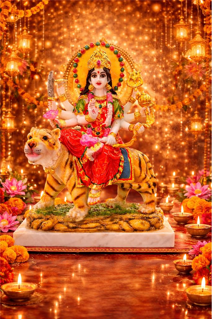 • Divine Maa Durga Idol – Beautifully crafted murti of Maa Durga seated on a tiger, symbolizing power, protection, and positivity. • Premium Marble Dust Material – Made from high-quality marble dust for a solid, durable, and premium finish. • Vibrant Hand-Painted Design – Rich colors with intricate detailing enhance the spiritual and decorative appeal. • Perfect for Home & Mandir – Ideal for home temples, पूजा spaces, or as a sacred decorative piece. • Auspicious & Spiritual Presence – Brings blessings, strength, and positive energy into your home. • Perfect for Gifting – Ideal for religious occasions, housewarming, festivals, and special celebrations.