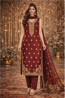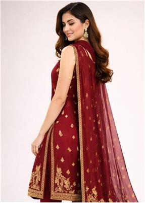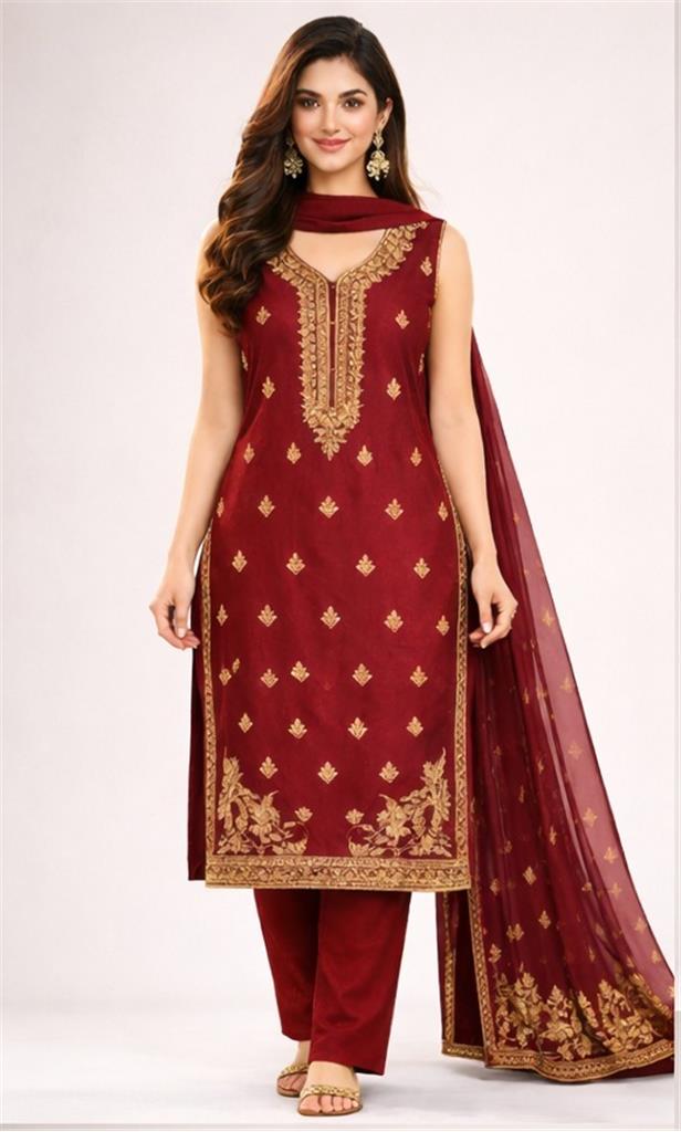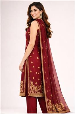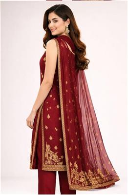 Elegant Burgundy Shalwar Suit Set – Stylish traditional outfit with rich gold embroidery detailing Premium Cotton Fabric – Soft, breathable, and comfortable for all-day wear Beautiful Gold Embroidery Work – Intricate neckline and border design for a luxurious look Classic Straight-Cut Kurta Design – Flattering silhouette suitable for casual and festive occasions Complete 3-Piece Set – Includes embroidered kurta, matching pants, and coordinating dupatta Comfortable Fit – Available in sizes 44, 48, and 50 Perfect for Special Occasions – Ideal for festivals, cultural events, family gatherings, and celebrations Elegant Traditional Style – Combines modern comfort with classic Indian fashion