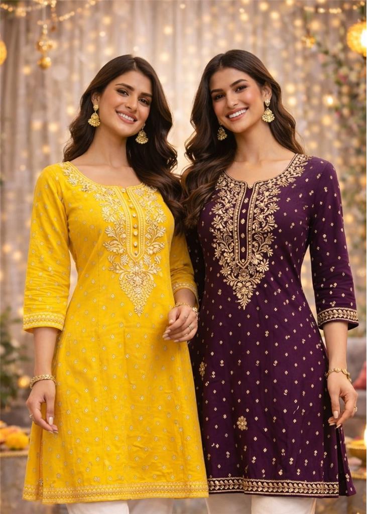 Vibrant Cotton Kurta Top Description (in points): Made from soft, breathable cotton material Detailed with elegant gold & cream embroidery design Available in 2 colors: Yellow & Dark Purple Stylish kurta-style top with a flattering fit Perfect for festive wear, casual outings & special occasions Lightweight and comfortable for all-day wear Sizes: Yellow: Size 38 Dark Purple: Size 38 Available in Endeavour Home delivery available Free delivery on orders above $500