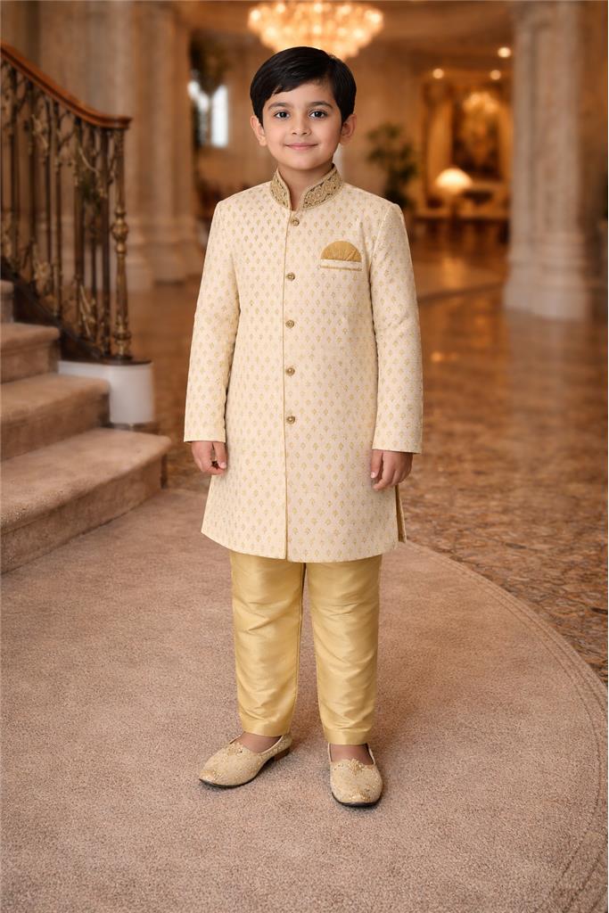 • Elegant Cream Kurta Design – Stylish cream kurta shirt enhanced with red & gold gem embroidery for a festive and eye-catching look. • Premium Silk Cotton Fabric – Soft, breathable silk cotton material ensures comfort for kids while maintaining a rich appearance. • Beautiful Embellishment Work – Detailed gem work adds a traditional and premium touch. • Matching Red & Gold Pants – Paired with vibrant red & gold pants for a bold and complete outfit. • Comfortable & Kid-Friendly Fit – Designed for easy movement and all-day comfort. • Perfect for Occasions – Ideal for weddings, festive events, family functions, and special celebrations.