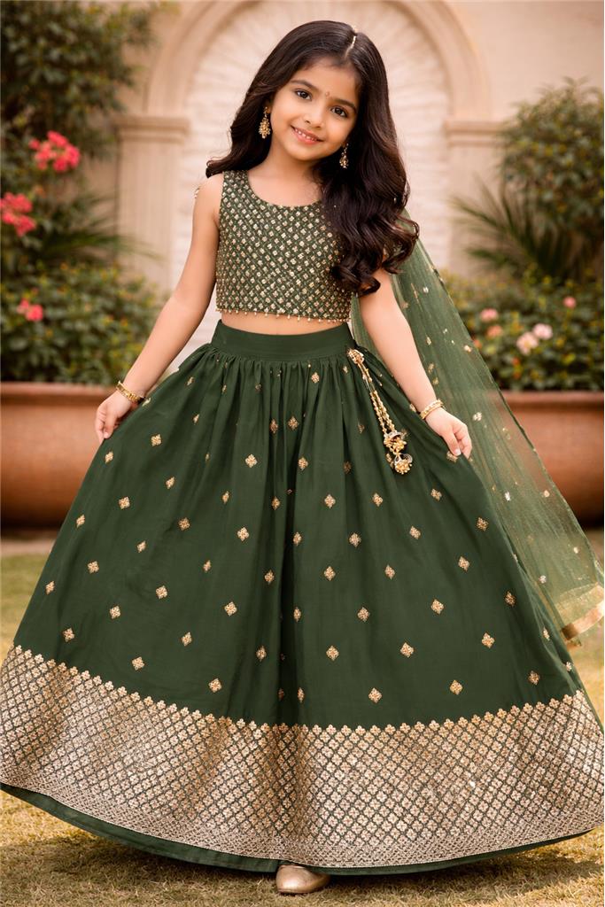 • Rich Dark Green Color – Deep dark green lehenga enhanced with gold design for a bold and luxurious look. • Elegant Gold Embellishment – Detailed gold work adds a traditional and festive touch. • Stylish Lehenga Design – Flowy and flared silhouette gives a graceful and elegant appearance. • Comfortable & Kid-Friendly Fit – Designed for easy movement and all-day comfort. • Perfect for Special Occasions – Ideal for weddings, festive events, birthdays, and family functions.