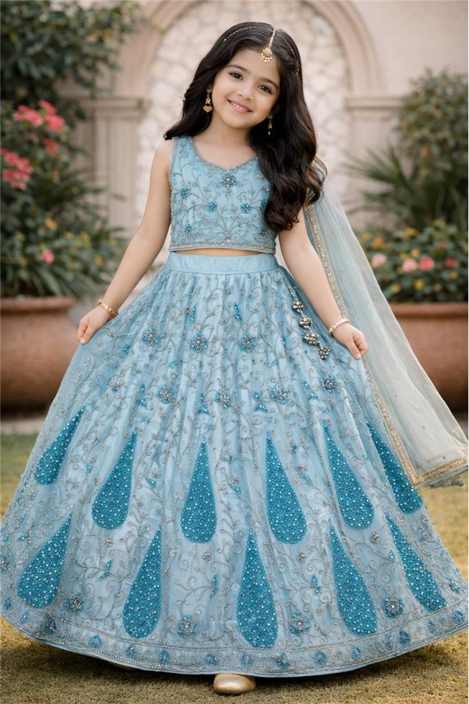 • Soft Light Blue Color – Beautiful light blue lehenga enhanced with silver & dark blue design for a stylish and elegant look. • Silver & Dark Blue Embellishment – Perfect contrast detailing adds a modern and festive appeal. • Stylish Lehenga Design – Flowy and flared silhouette gives a graceful and charming appearance. • Comfortable & Kid-Friendly Fit – Designed for easy movement and all-day comfort. • Perfect for Special Occasions – Ideal for weddings, festive events, birthdays, and family functions.