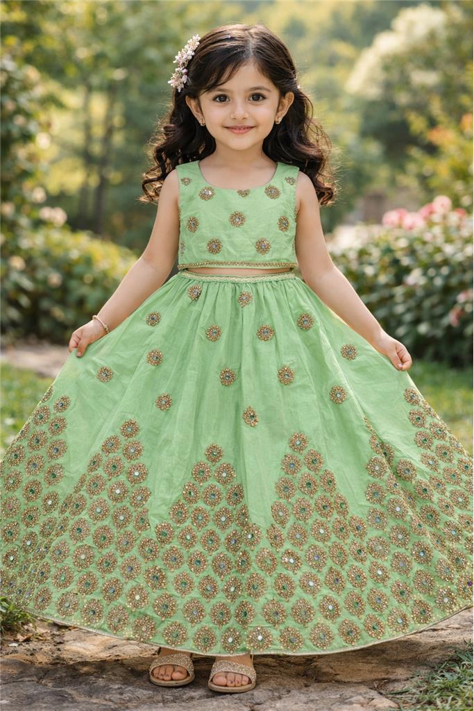 • Elegant Green Color – Beautiful green lehenga enhanced with gold design for a rich and festive look. • Classic Gold Embellishment – Detailed gold work adds a traditional and luxurious touch. • Stylish Lehenga Design – Flowy and flared silhouette gives a graceful and elegant appearance. • Comfortable & Kid-Friendly Fit – Designed for easy movement and all-day comfort. • Perfect for Special Occasions – Ideal for weddings, festive events, birthdays, and family functions.