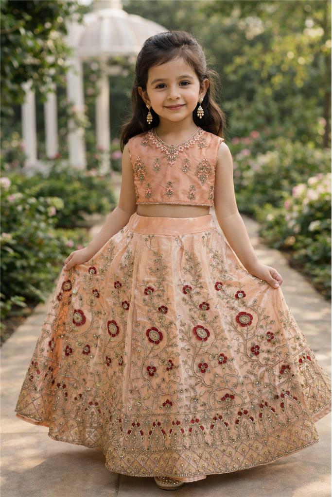 • Soft Peach Color – Elegant peach lehenga enhanced with red & gold design for a warm and festive look. • Red & Gold Embellishment – Beautiful contrast detailing adds a rich, eye-catching, and traditional charm. • Stylish Lehenga Design – Flowy and flared silhouette gives a graceful and charming appearance. • Comfortable & Kid-Friendly Fit – Designed for easy movement and all-day comfort. • Perfect for Special Occasions – Ideal for weddings, festive events, birthdays, and family functions.