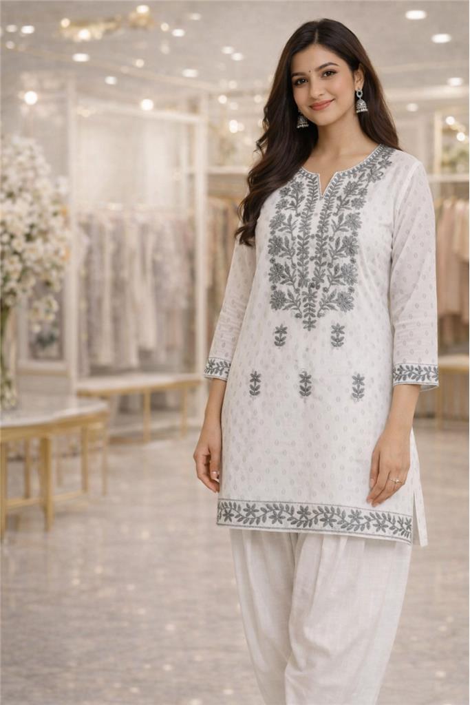 • Elegant White Top – Classic white color enhanced with silver embroidery design for a clean and sophisticated look. • Stylish Silver Embroidery – Beautiful detailed front and border work adds a modern and graceful touch. • Perfect Everyday Wear – Simple yet elegant design suitable for daily wear and casual outings. • Comfortable & Relaxed Fit – Designed for ease, breathability, and all-day comfort. • Versatile Styling – Pairs easily with shalwar, pants, or palazzos for a complete look.