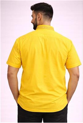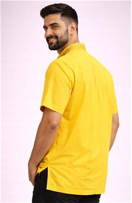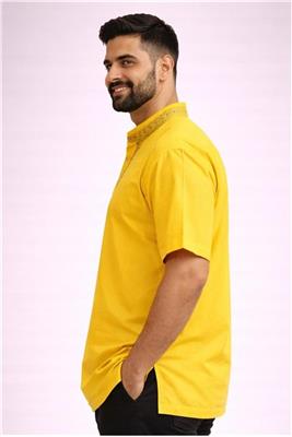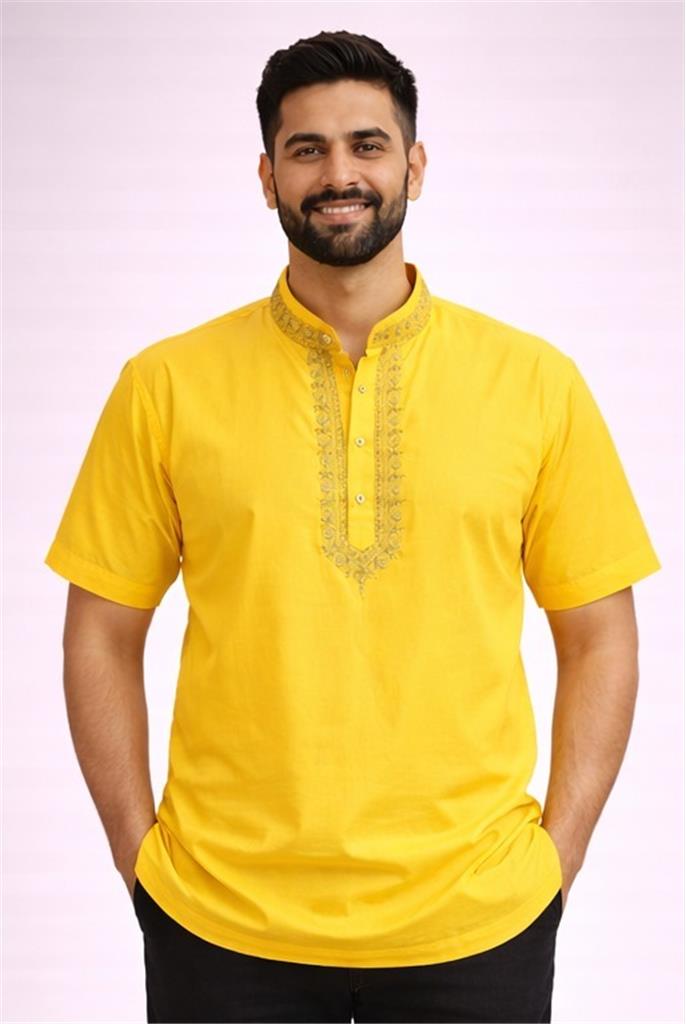 Yellow Kurta * Stylish Yellow Kurta Shirt – Bright and modern ethnic wear * Premium Cotton Fabric – Lightweight and breathable for all-day comfort * Short Sleeve Design – Perfect for casual and summer wear * Gold Embroidery Detail – Enhances traditional style * Available Sizes – 38 to 52 * Perfect for Casual & Festive Use – Parties, outings & events