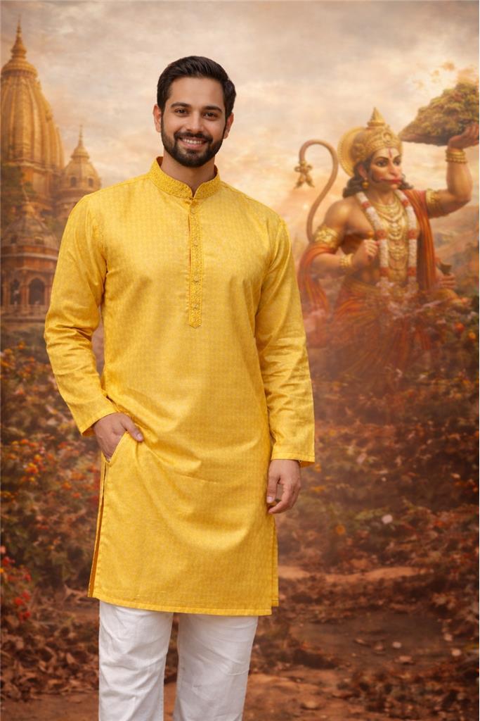 • 👨 Men’s Traditional Kurta Suit Set designed for festive and cultural celebrations • 🟡 Elegant Yellow Kurta Design perfect for Hanuman Jayanti and religious occasions • 👖 White Pants Included complete ready-to-wear traditional outfit • 🧵 Premium Quality Fabric soft, comfortable, and suitable for long wear • ✨ Classic Ethnic Style adds a traditional and stylish look for festivals and events • 🙏 Perfect for Hanuman Jayanti Celebrations temple visits, pujas, and festive gatherings • 👗 Comfortable & Stylish Fit ideal for both casual and festive occasions • 📏 Available Sizes: 38, 40, 42, 48, 50