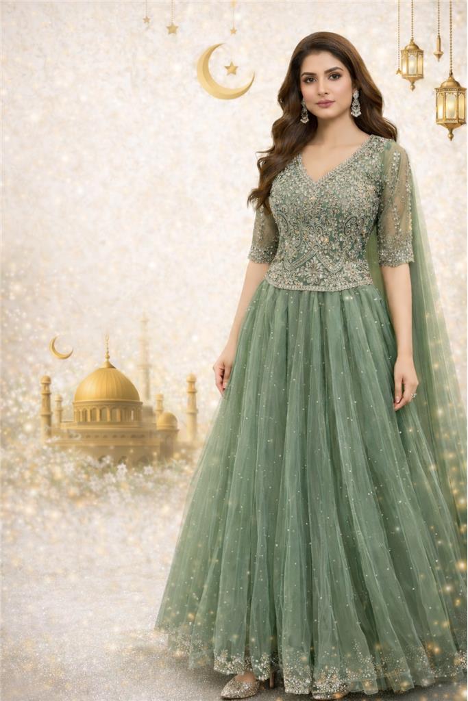 ✨ Women’s Eid Special Embroidered Anarkali Gown Graceful Festive Anarkali Design – Flowing silhouette that creates a regal and elegant look Premium Net & Embroidered Fabric – Beautifully crafted with intricate thread and sequin work Soft Pastel Green Shade – A refreshing, sophisticated colour perfect for Eid celebrations Detailed Handwork Bodice – Rich embroidery adds luxury and festive charm Flowy Flared Skirt – Lightweight layers with delicate embellishments for effortless movement Elegant Sleeves & Matching Dupatta – Adds modesty and grace, ideal for festive occasions Perfect for Eid & Special Occasions – Suitable for Eid prayers, family gatherings, dinners, and celebrations Comfortable & Breathable Fit – Designed for all-day festive wear Timeless Traditional Appeal – A blend of classic elegance and modern styling Statement Festive Outfit – Designed to make you stand out with poise and confidence 🌙 Celebrate Eid in timeless elegance — refined, graceful, and unforgettable.