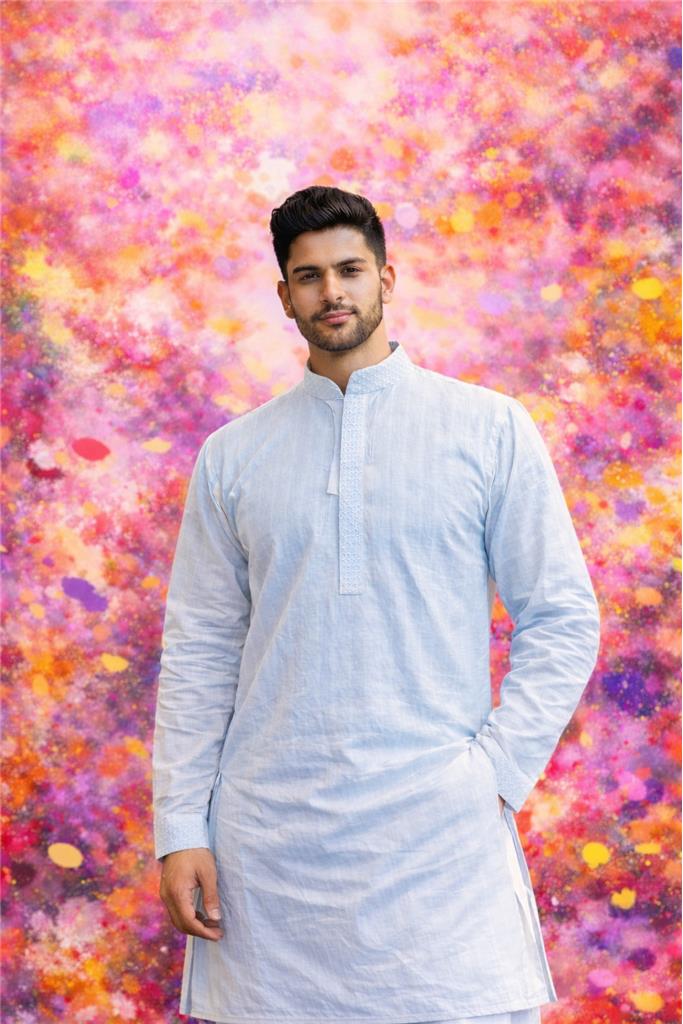 Men’s Light Blue Striped Kurta — Holi Special:- Soft pastel blue kurta — a refreshing festive Holi shade Elegant vertical stripe texture for a subtle stylish look Mandarin (band) collar with minimal detailing Buttoned placket adds a neat traditional finish Full sleeves with clean cuffs for a polished appearance Straight cut, knee-length silhouette Relaxed fit for easy movement during celebrations Lightweight & breathable fabric — perfect for outdoor Holi fun Comfortable for long hours of color play & gatherings Looks vibrant as colors splash over the pastel base Easy to pair with white pajama, churidar, or trousers Ideal for Holi parties, festive photoshoots & cultural events Day-to-evening festive wear option Easy care: gentle wash recommended after Holi celebrations All sizes available 38 - 52