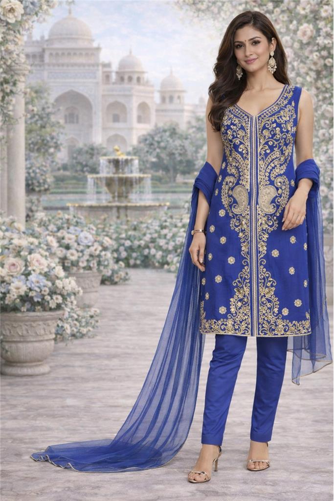 • Rich Royal Blue Color – Deep royal shade enhanced with gold embroidery design for a bold and luxurious look. • Intricate Gold Embroidery – Detailed craftsmanship adds a premium traditional touch with a subtle shine. • Complete 3-Piece Set – Includes kurta, matching pants, and shawl for a fully coordinated outfit. • Premium Cotton Fabric – Soft, breathable cotton material ensures comfort for all-day wear. • Comfortable & Elegant Fit – Designed to provide ease of movement while maintaining a graceful silhouette. • Perfect for Occasions – Ideal for festive wear, parties, and special gatherings.