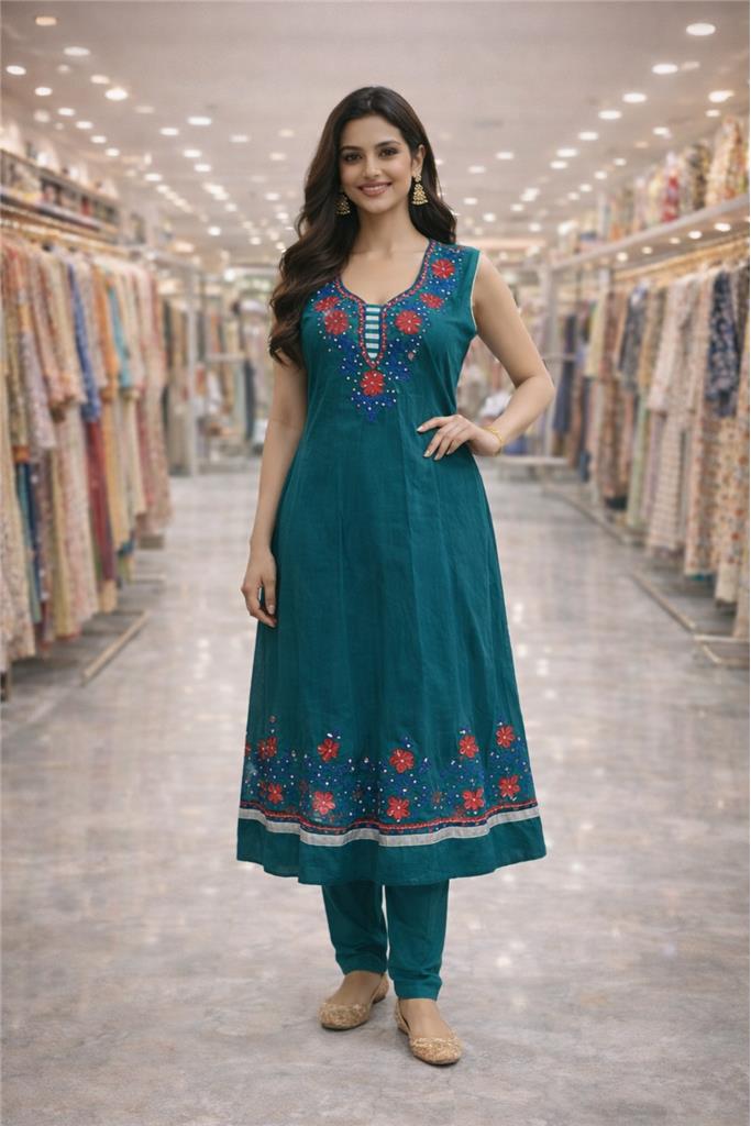 ✨ Designer Ethnic Suit Set ✨ Elegant designer ethnic suit set with a graceful silhouette Beautiful floral embroidery on neckline and hemline Rich solid color fabric with a soft, flowy drape Stylish V-neckline with detailed embroidery work Sleeveless design for a modern and elegant look Straight-cut kurta offering a comfortable and flattering fit Comes with matching pants for a complete ethnic style Lightweight and breathable fabric for all-day comfort Perfect for festive occasions, family functions, casual outings & celebrations Easy to style with flats, juttis, or statement jewelry Premium stitching and finishing for long-lasting wear Size Available in Green 40, 46 & 48 Size Available in Red 38, 40 & 48