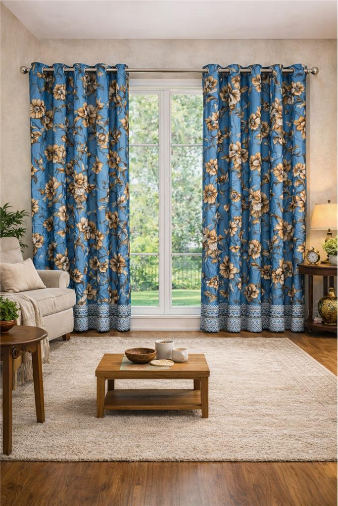 • Elegant Floral Design – Beautiful blue curtains with rich brown flower patterns for a warm, stylish look. • Semi-Sheer Fabric – Softly filters light while maintaining privacy. • Modern & Premium Finish – Adds a touch of elegance to any interior. • Easy Installation – Eyelet rings for quick setup and smooth movement. • Perfect for Any Room – Ideal for living rooms, bedrooms, and stylish spaces. • Set Includes: 3 Panels • Panel Size: 4 ft (W) × 7 ft (L)**