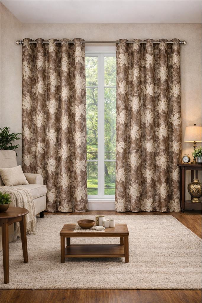 • Elegant Leaf Design – Brown curtain with a stylish leaf pattern to enhance any décor. • Semi-Sheer Fabric – Gently filters light while maintaining privacy for a cozy atmosphere. • Modern & Premium Look – Adds a fresh, sophisticated touch to your space. • Easy Installation – Eyelet rings for quick hanging and smooth sliding. • Perfect for Any Room – Ideal for living rooms, bedrooms, and modern interiors. • Set Includes: 3 Panels • Panel Size: 4 ft (W) × 7 ft (L)