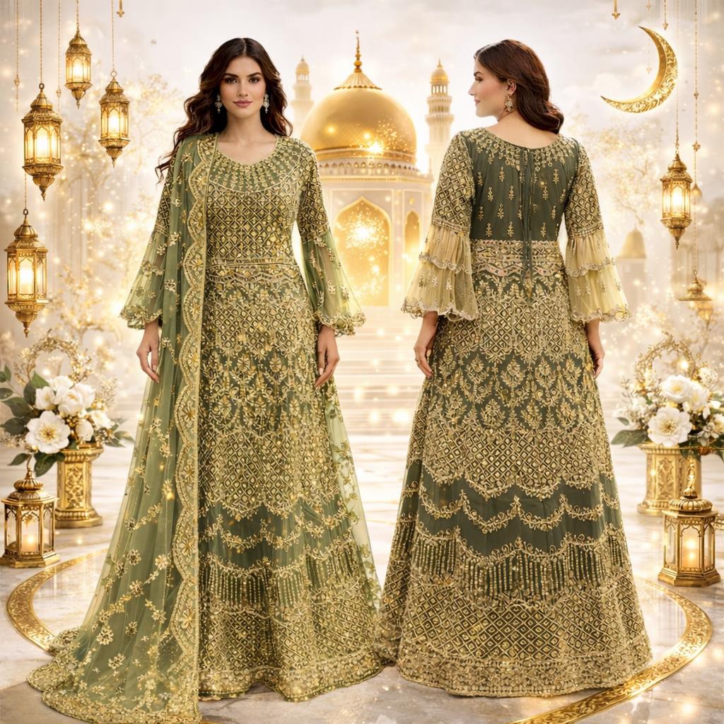 🌙 Celebrate Eid in timeless elegance with this beautifully crafted festive ensemble, designed to make every moment feel special. ✨ Intricate gold embroidery and luxurious detailing create a rich, graceful look perfect for festive gatherings and celebrations. 👗 Premium-quality fabric ensures a comfortable yet regal drape, allowing you to move effortlessly throughout the day. 🌸 Thoughtfully designed with a flattering silhouette and exquisite craftsmanship for a refined, festive appearance. 💫 Ideal for Eid, weddings, and special occasions, this outfit blends tradition with modern sophistication.