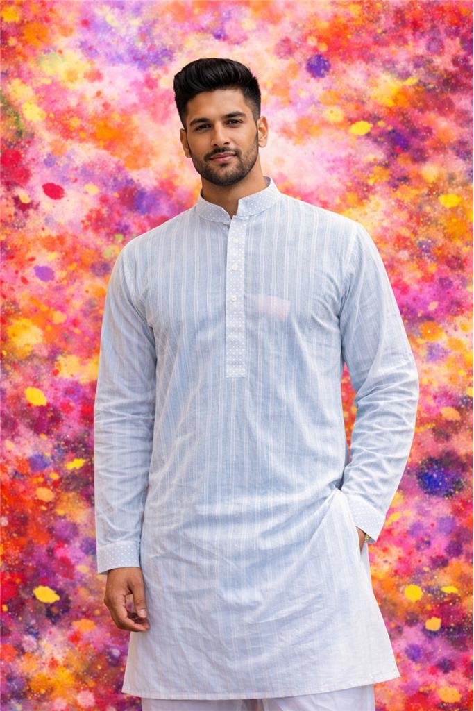 Men’s Light Blue Striped Kurta — Holi Special:- Soft pastel blue kurta — a refreshing festive Holi shade Elegant vertical stripe texture for a subtle stylish look Mandarin (band) collar with minimal detailing Buttoned placket adds a neat traditional finish Full sleeves with clean cuffs for a polished appearance Straight cut, knee-length silhouette Relaxed fit for easy movement during celebrations Lightweight & breathable fabric — perfect for outdoor Holi fun Comfortable for long hours of color play & gatherings Looks vibrant as colors splash over the pastel base Easy to pair with white pajama, churidar, or trousers Ideal for Holi parties, festive photoshoots & cultural events Day-to-evening festive wear option Easy care: gentle wash recommended after Holi celebrations All sizes available 38 - 52