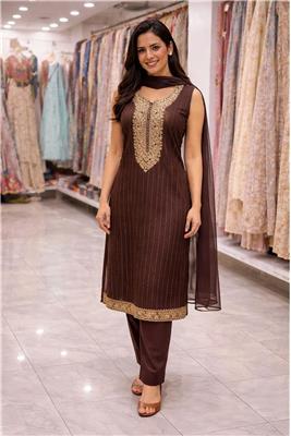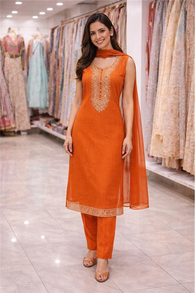 Elegant straight-fit suit set with matching pant and dupatta Comes with a beautifully coordinated dupatta for a complete ethnic look Features intricate ethnic embroidery with all-over subtle motifs Crafted from soft, lightweight, and breathable fabric Comfortable for all-day wear, suitable for every season Sleeveless suit design adds a modern and graceful touch Fine finishing and premium stitching for a classy appearance Relaxed fit that flatters all body types Colorfast fabric – retains color and shine after wash Easy to style with heels, flats, juttis, or traditional jewelry Ideal for festive wear, office wear, casual outings, family functions & daily wear Perfect choice for gifting or special occasions 📏 Available Colors and Sizes • Orange: 38, 40, 42, 48 • Brown: 38, 40, 42, 44 • Dark Blue: 38, 40, 42