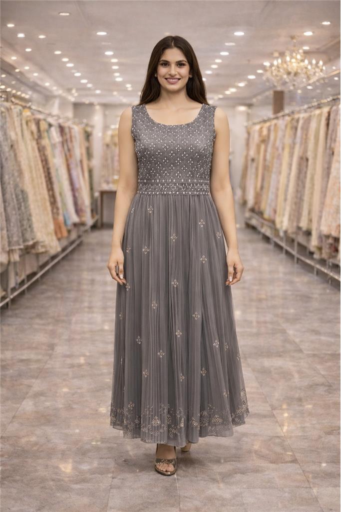 Women’s Embroidered Party Gown — Product Points:- Elegant floor-length grey gown with a graceful feminine silhouette Beautiful all-over delicate embroidery for a premium festive look Sleeveless design with a classic round neckline Fitted bodice with defined waist for a flattering shape Flowing pleated skirt adds movement and sophistication Soft, lightweight fabric for comfortable long wear Subtle shimmer detailing enhances evening appeal Perfect blend of modern style and traditional charm Ideal for receptions, parties, engagements & festive occasions Suitable for both day and evening events Easy to style with heels and minimal jewelry Easy care: gentle wash / dry clean recommended