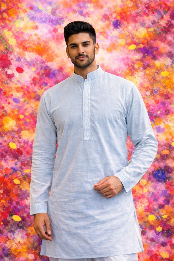 Men’s Classic White Embroidered Kurta — Holi Special:- Elegant solid white kurta — perfect base for vibrant Holi colors Modern mandarin (band) collar for a stylish festive look Subtle self-embroidery on the placket adds refined ethnic charm Full sleeves for a graceful traditional appearance Straight cut, knee-length silhouette for classic styling Relaxed fit allows free movement during celebrations Lightweight & breathable fabric — comfortable for outdoor Holi events Soft and skin-friendly material suitable for long festive wear Looks better as colors splash — enhances the festive vibe Easy to pair with pajama, churidar, or trousers Ideal for Holi parties, festive gatherings & cultural celebrations Suitable for day-long celebrations and photoshoots Easy care: gentle wash recommended after color play All sizes available 38 - 60